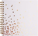 Piękny i elegancki album ze złotymi wytłaczanymi plamkami i złotą spiralą. Lekko kremowa okładka i kremowe karty w albumie są idealnym miejscem do wpisywania dedykacji jako księga gości, wklejania zdjęć i innych pamiątek. 30 arkuszy (60 stron) 180g/m2. Format 20 x 20 cm. Kartki w kolorze kremowym. Grubość okładki 3 mm. Złota spirala 25 mm.