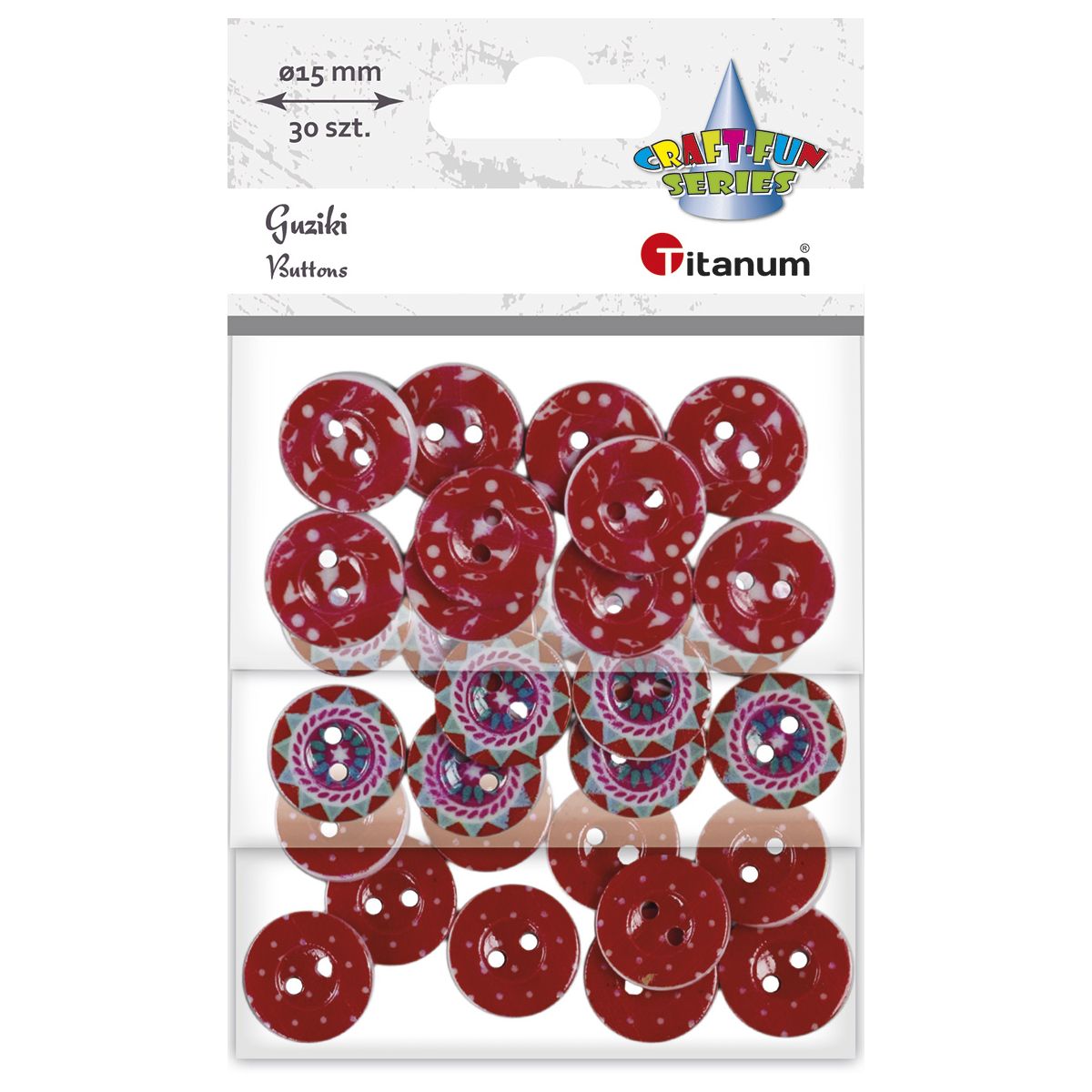 Guziki plastikowe, okrągłe, średnica: 15 mm, tonacja czerwona. 3 wzory. 30 sztuk.