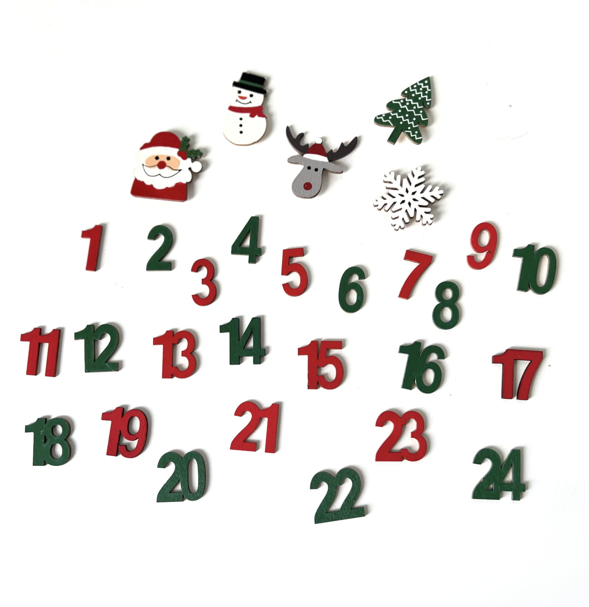 Zestaw zawiera liczby od 1 do 24 oraz 5 drewnianych elementów ze świątecznymi motywami.