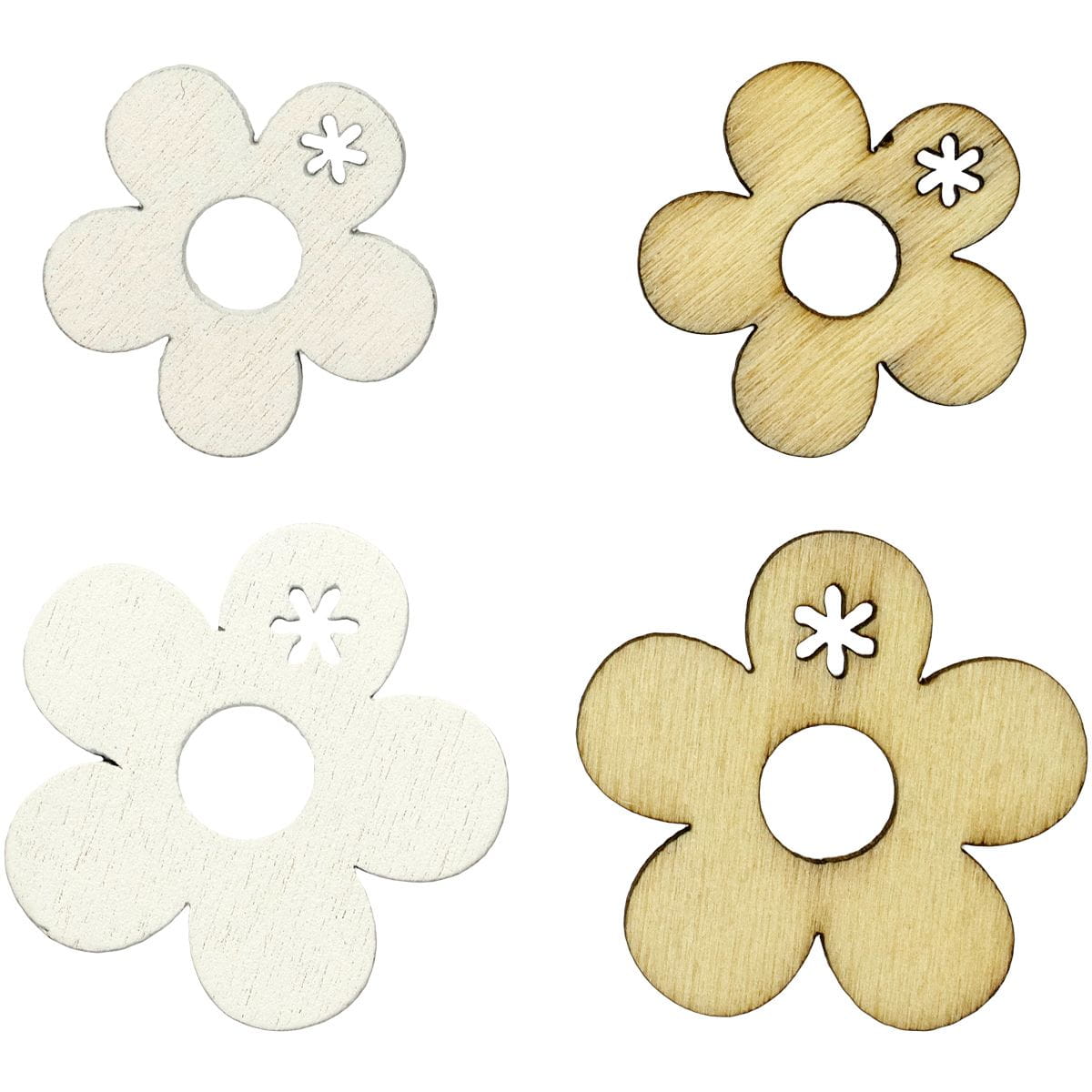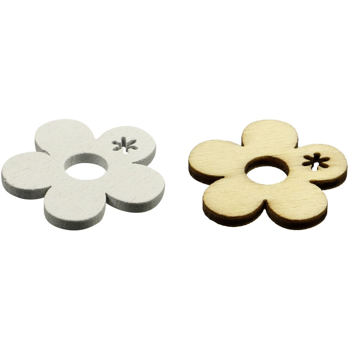 Drewniane kwiatki, wykonane ze sklejki o grubości 2,5 mm. Kolor: naturalny, biały, wymiary: 23 mm/ 30 mm. Opakowanie 12 szt.