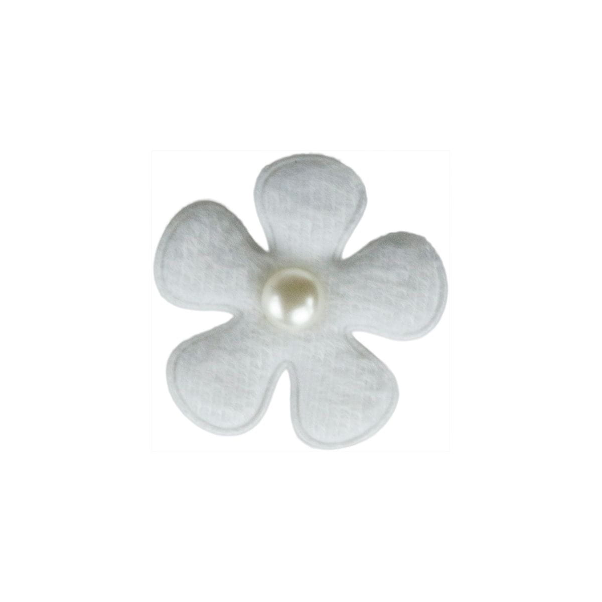 Aplikacje materiałowe kwiaty 45 x 50 mm z perełką 10mm, białe. Opakowanie 15 szt.