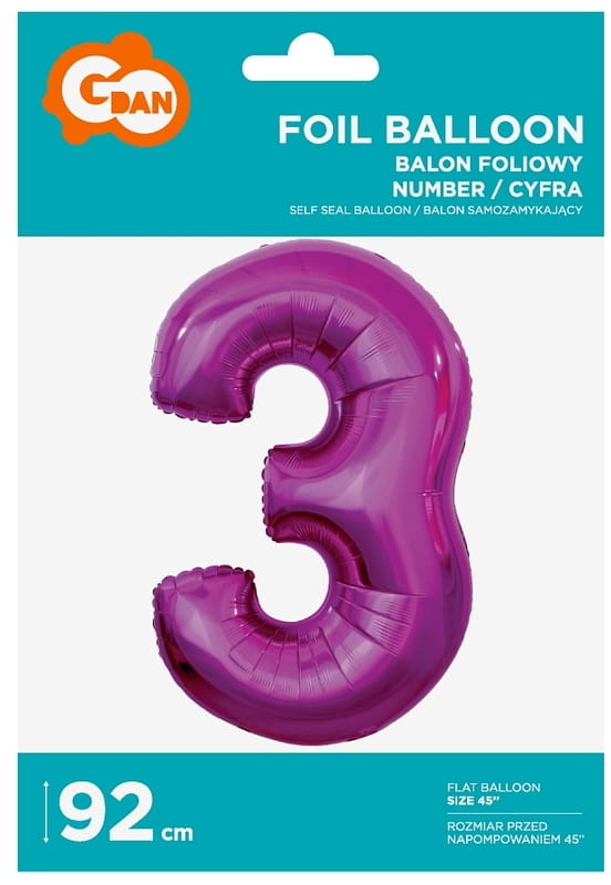 Balon foliowy Cyfra 3 różowa 92 cm, Godan