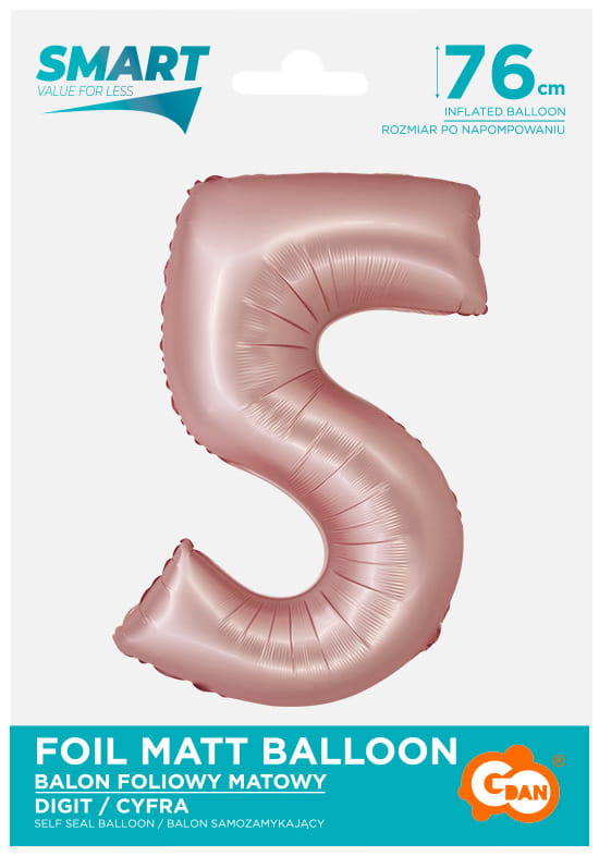 Balon foliowy Cyfra 5 różowa jasna matowa 76 cm, GoDan