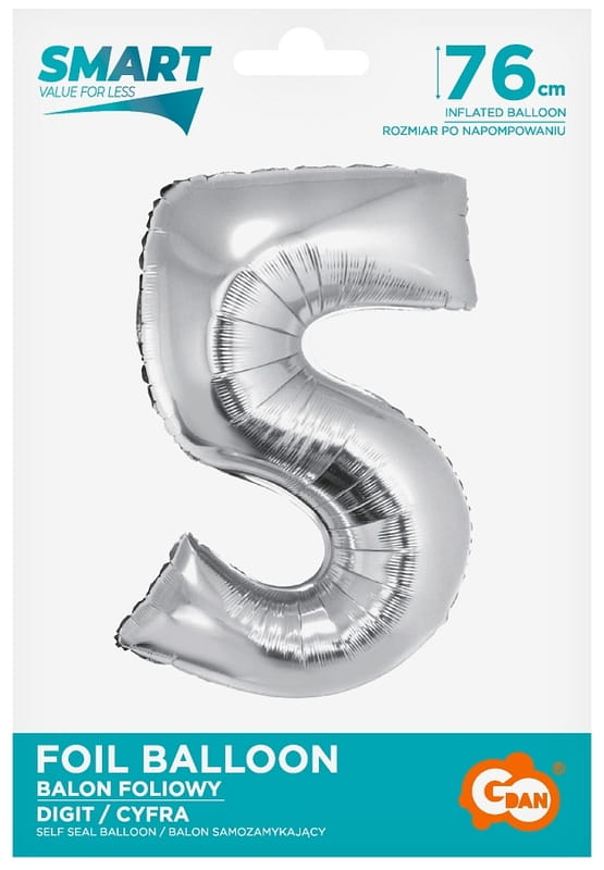 Balon foliowy Cyfra 5 srebrna 76 cm, GoDan