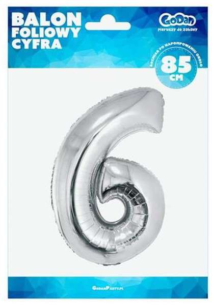 Balon foliowy Cyfra 6 srebrna 85 cm, GoDan