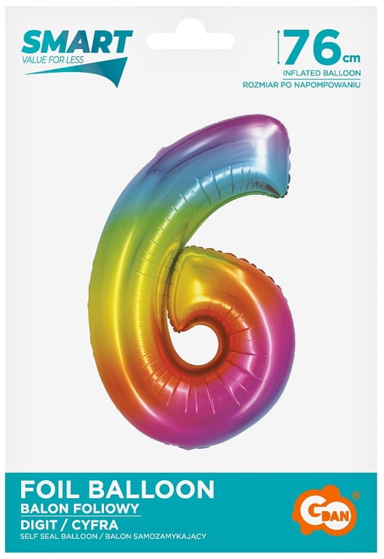 Balon foliowy Cyfra 6 tęczowa 76 cm, GoDan