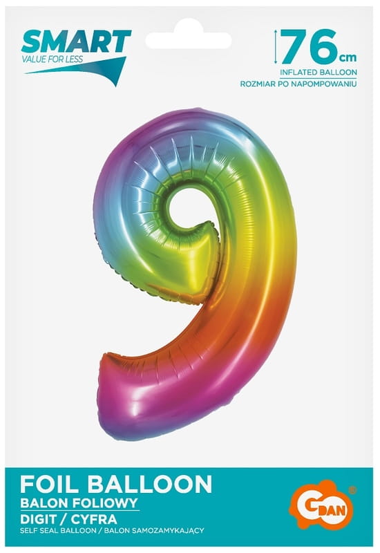 Balon foliowy Cyfra 9 tęczowa 76 cm, GoDan