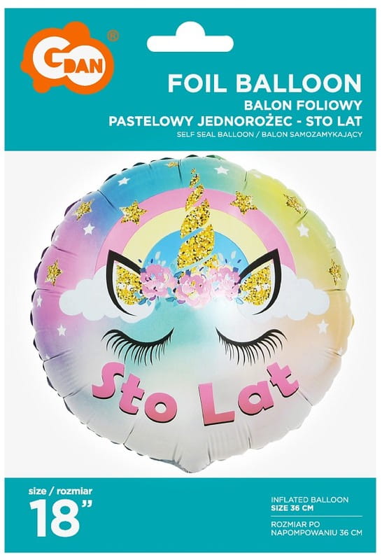 Balon foliowy Pastelowy Jednorożec Sto Lat 36 cm, GoDan