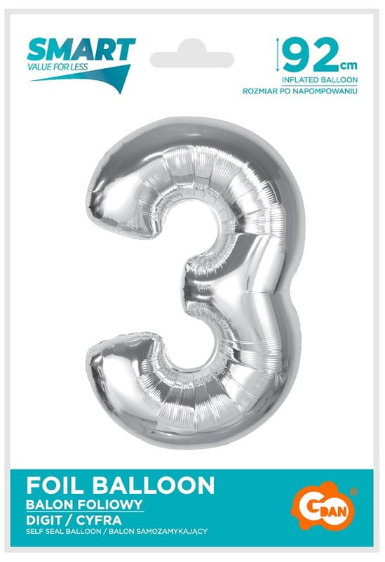 Balon foliowy Smart, cyfra 3, srebrna, 92 cm #BFC38, GoDan