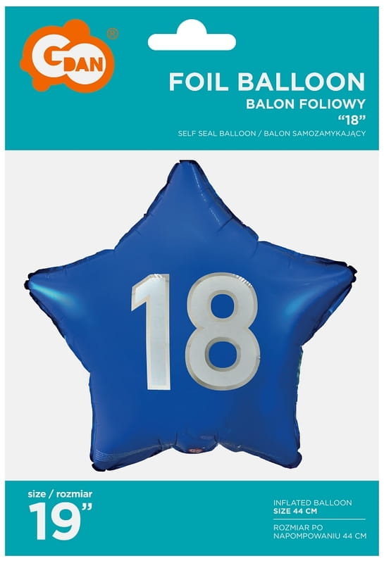 Balon foliowy cyfra 18 gwiazda niebieska 44 cm, Godan