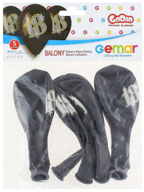 Balony Osiemnastka 18 czarne 5 sztuk 30 cm, Godan