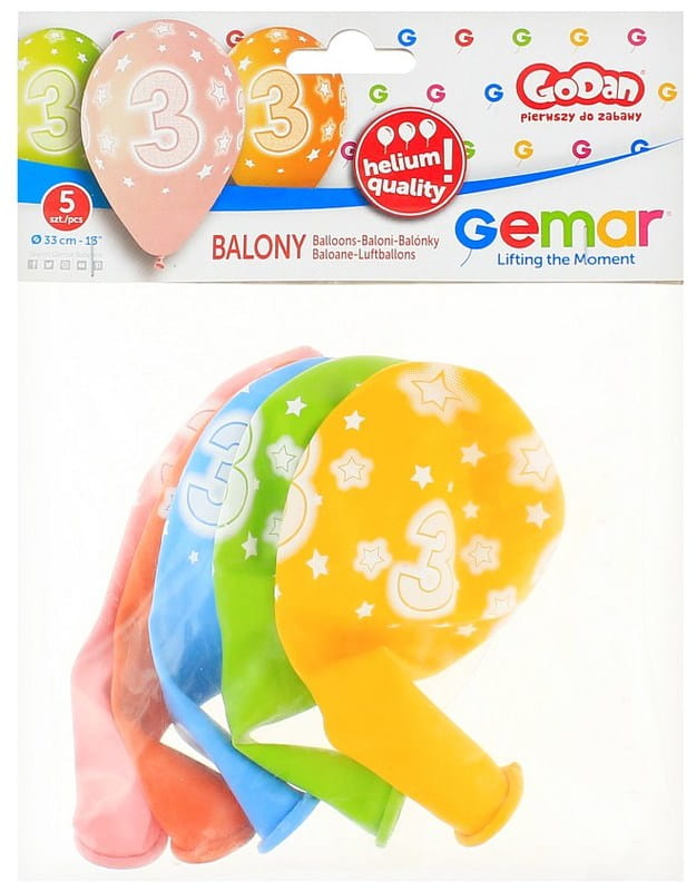 Balony kolorowe cyfra 3 - 5 sztuk 33 cm, GoDan