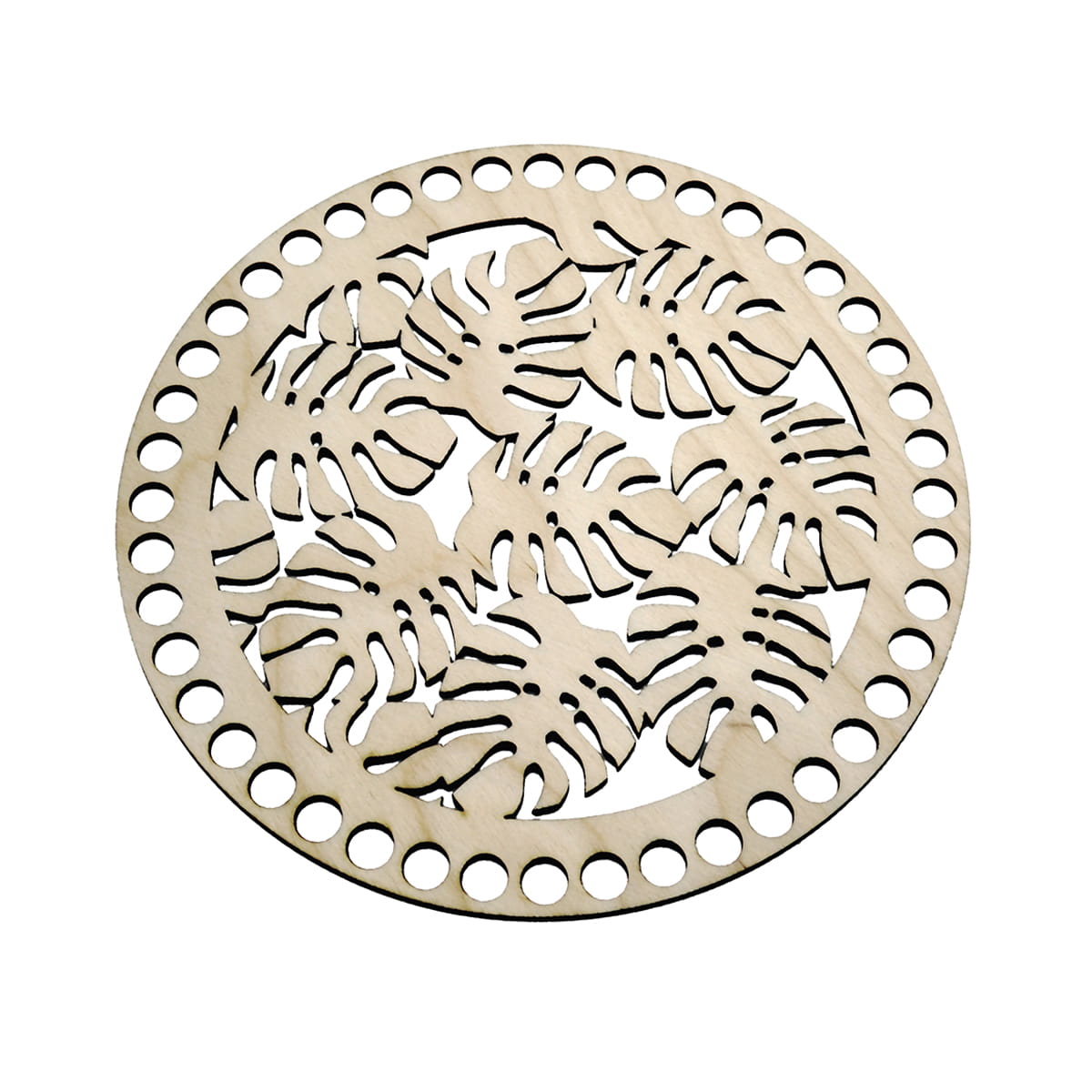Okrągła baza z ażurowym motywem liści monstery do prac wyplatanych ze sznurków bawełnianych. Wieczko z modnym motywem roślionnym to eleganckie uzupełnienie ręcznie robionego kosza lub pojemnika ze sznurka. Baza jest obustronnie szlifowana, dzięki czemu nie ma przypaleń i prezentuje się bardzo estetycznie. Średnica: 20 cm Grubość: 0,3 cm Wielkość otworów: 1 cm Odległość między otworami: 0,3 cm Materiał: sklejka brzozowa