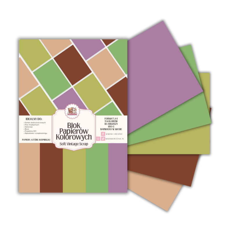 Blok papierów kolorowych A4 180g 10 arkuszy Soft Vintage Scrap, MaDam Creative
