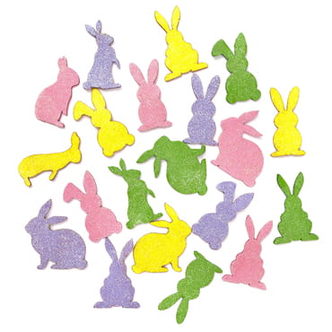 Brokatowe naklejki z pianki w kształcie króliczków w czterech pastelowych kolorach są idealne zarówno do zdobienia wielkanocnych projektów kreatywnych takich kartki świąteczne, albumy, pudełka, opakowania prezentów jak prac całorocznych.