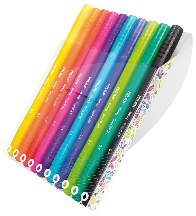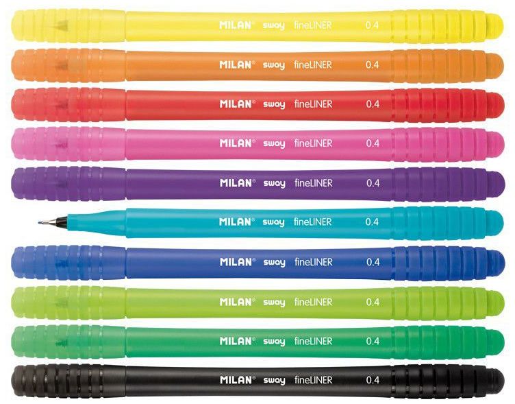 Zestaw 10 cienkopisów SWAY FINELINER z końcówką 0,4 mm o ergonomicznym kształcie w elastycznym etui. Kolory: żółty, pomarańczowy, czerwony, różowy, fioletowy, niebieski, jasnoniebieski, zielony, jasnozielony i czarny. Końcówka wykonana z włókna z metalową podstawą. Obudowa w tym samym kolorze co tusz (na bazie wody). Nasadkę można przymocować do końcówki cienkopisu. Etui pozwala założyć pokrywę i ustawić cienkopisy w wygodnej pozycji biurkowej. Oryginalny produkt stworzony przez własny dział badawczo-rozwojowy MILAN. Rozmiar cienkopisu: 15,2 x 1,1 cm. Rozmiar etui: 15,4 x 11 x 1,3 cm.