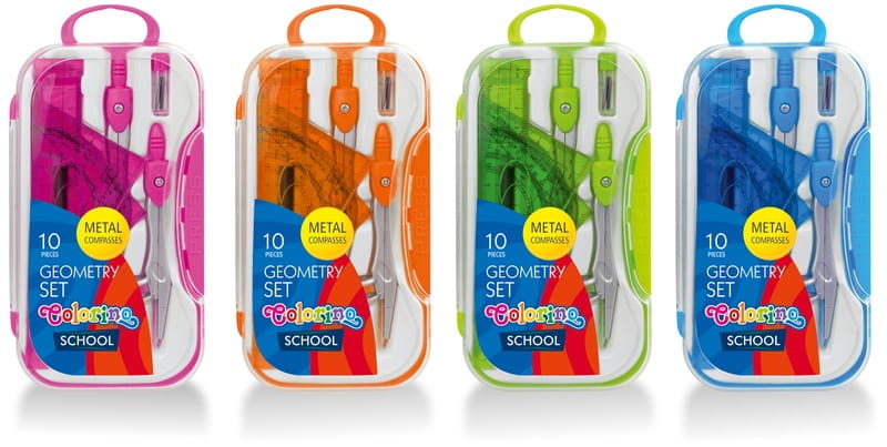 Cyrkiel szkolny z zestawem geometrycznym 10 elementów w etui, Colorino