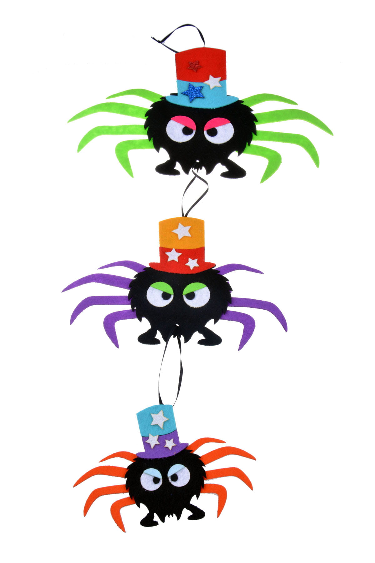 Oryginalny design: Trzy pajączki, każdy z kolorowym elementem, tworzą niepowtarzalną kompozycję.
