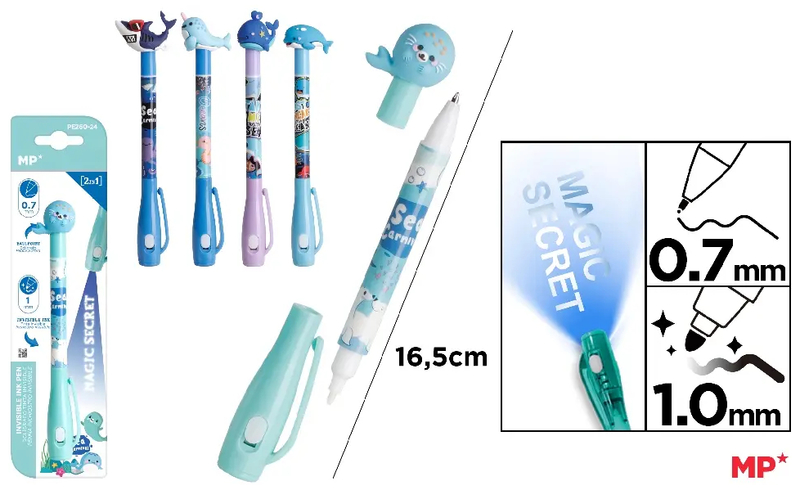 Długopis szpiegowski 2 w 1. Jedna końcówka z niewidzialnym atramentem, druga z niebieskim atramentem. Plastikowy korpus z fantazyjnym wzorem, z latarką w skuwce do podświetlenia wiadomości napisanej niewidzialnym tuszem i odszyfrowania jej! Końcówka 0,7 mm z niebieskim tuszem i druga 1 mm końcówka z włókna z niewidzialnym tuszem. Blister 1szt. Wzór: Morskie Zwierzaki