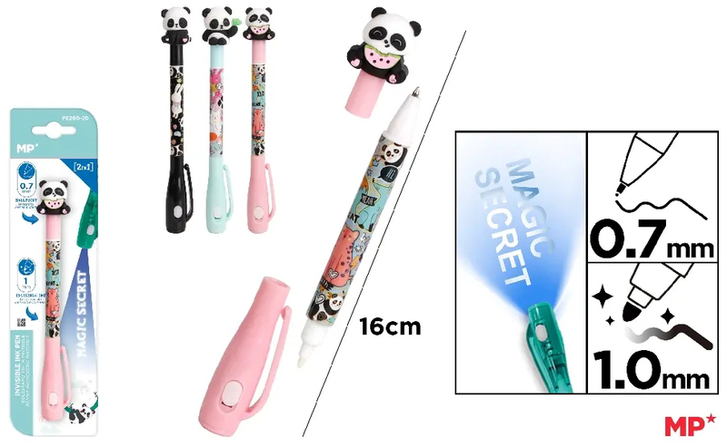 Długopis szpiegowski 2 w 1. Jedna końcówka z niewidzialnym atramentem, druga z niebieskim atramentem. Plastikowy korpus z fantazyjnym wzorem, z latarką w skuwce do podświetlenia wiadomości napisanej niewidzialnym tuszem i odszyfrowania jej! Końcówka 0,7 mm z niebieskim tuszem i druga 1 mm końcówka z włókna z niewidzialnym tuszem. Blister 1szt. Wzór: panda