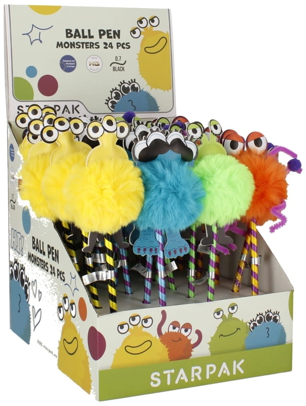 Teraz nawet długopis może Cię wprowadzić w świat zabawek. Starpak wyszedł naprzeciw Waszym oczekiwaniom i wprowadził do swojej oferty zamykane długopisy zakończone śmieszną pluszową figurką Monster. Idealny do użytkowania w szkole w domu. Zapoznaj się również z innymi produktami Starpaka dedykowanymi dla szkoły i biura! Wkład czarny, grubość 0,7 mm. Wykonany z trwałego materiału, figurka Monster występuje w 4 kolorach: żółty, pomarańczowy, niebieski, zielony. Produkt nieodpowiedni dla dzieci poniżej 3 lat.
