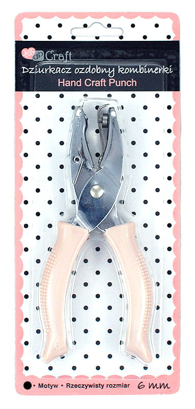 Dziurkacz ozdobny - kombinerki służy do wycinania drobnych wzorów, co czyni go niezawodnym narzędziem w tworzeniu konfetti. Stalowa głowica pozwala na wycinanie wzorów w papierze, plastiku, skórze, filcu oraz cienkim metalu. - Wygodny gumowy uchwyt, - Wbudowany pojemnik na konfetti. Wielkość wzoru: 6 mm
