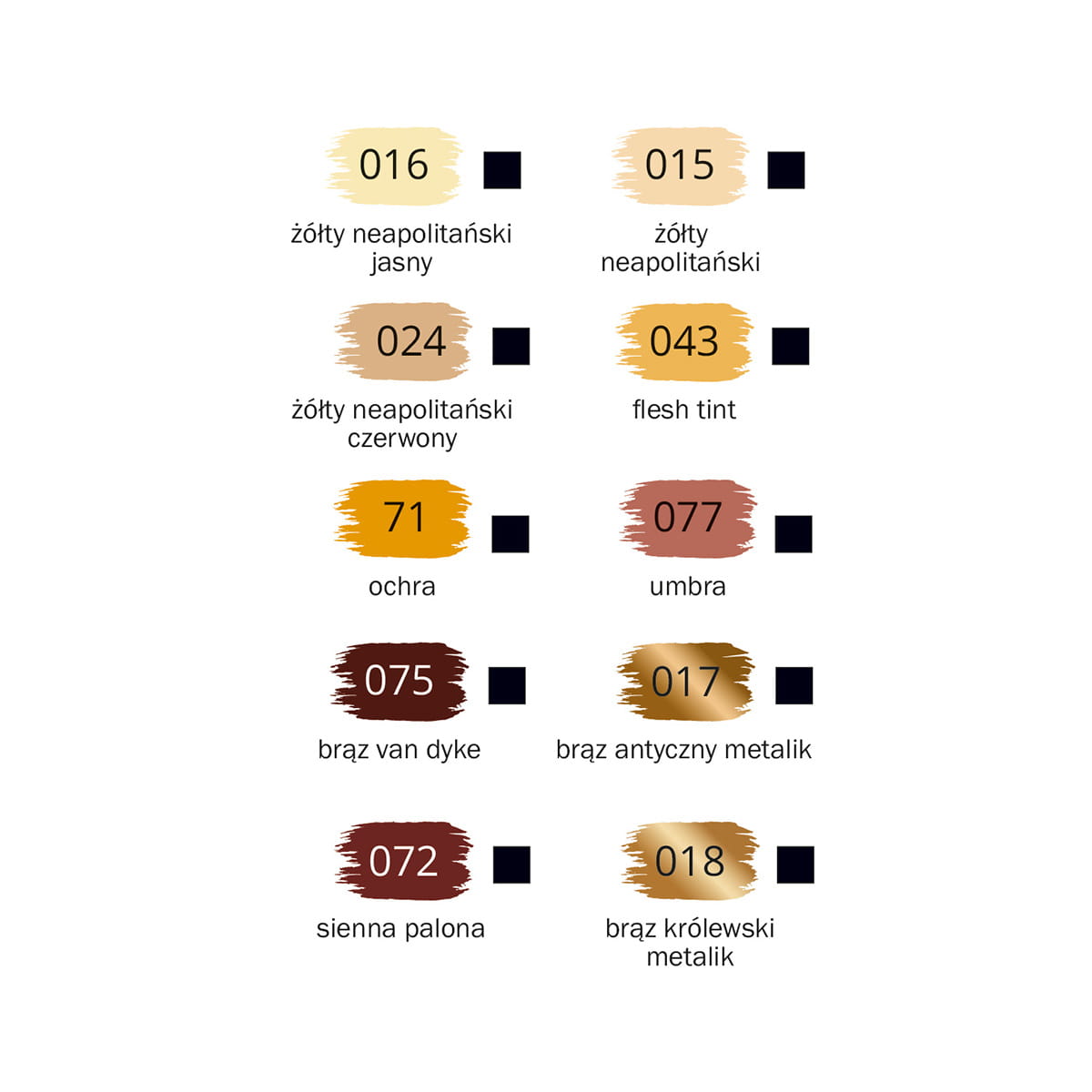 - Zawiera kolory: żółty neapolitański jasny, żółty neapolitański, żółty neapolitański czerwony, flesh tint, ochra, umbra, brąz van dyke, brąz antyczny metalik, sienna palona, brąz królewski metalik