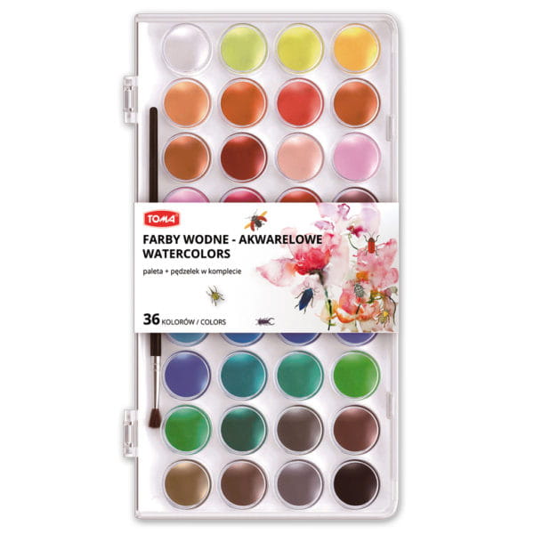Zestaw farb akwarelowych w 36 żywych kolorach. Zestaw zawiera 36 farbek o średnicy 30 mm, pędzelek i odczepiane wieczko, które może być używane jako paleta. Farbki przeznaczone są dla dzieci od 3 lat. Zgodne z normą EN – 71.