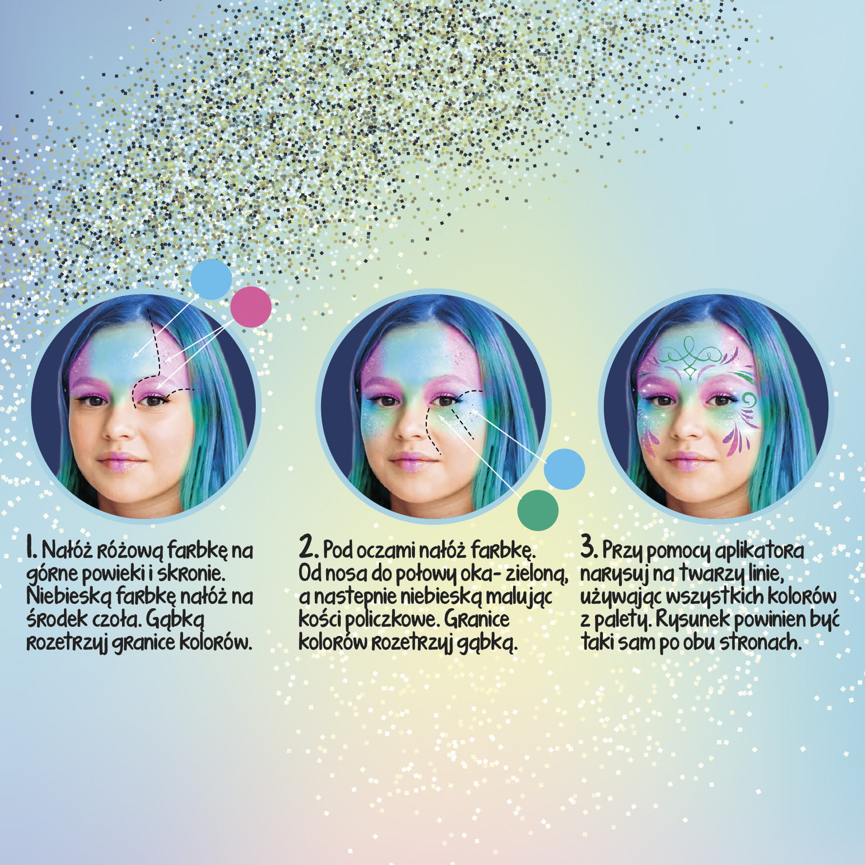 Zestaw 4 farbek do twarzy w brokatowych kolorach – fioletowym, różowym, niebieskim i zielonym. Są bardzo wydajne i wygodne w użyciu, dzięki czemu farbki wystarczą na pomalowanie wielu różnych stylizacji. Głębokie odcienie połączone z perłowym efektem i brokat pozwolą stworzyć makijaż jedyny w swoim rodzaju! Twoja stylizacja będzie mienić się i wyjątkowo błyszczeć! Zestaw zawiera aplikator, który doskonale sprawdzi się w pokryciu większych powierzchni oraz rysowaniu dokładnych kontur oraz gąbeczkę idealna do blendowania. Farbki są bezpieczne w użytkowaniu, co potwierdzają przeprowadzone testy dermatologiczne. Z tyłu opakowania instrukcja jak krok po kroku stworzyć wybraną stylizację. Stwórz spektakularny makijaż razem z KIDEA, od którego wszyscy nie będą mogli oderwać wzroku!