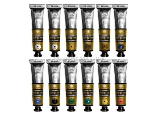 Kolory w zestawie: biel cynkowa, biel tytanowa, ugier żółty, umbra palona, siena palona, błękit paryski, ultramaryna niebieska, czerń sadza, zieleń chromowa, zieleń Rembrandta, kadmium żółty jasny, kadmium czerwony jasny