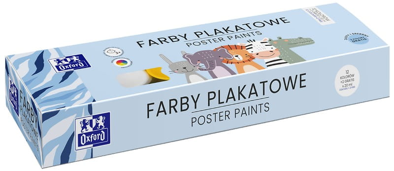 Farby plakatowe Oxford Kids doskonale sprawdzą się w każdej szkole czy przedszkolu. Poza intensywnymi kolorami i gęstą konstystencją Oxford stawia na wysoką jakość opakowań. W kubeczkach zastosowano pełny gwint, dzięki czemu wieczko zakręca się szczelnie, bez przekręcenia. Farby nie wysychają i można ich używać jeszcze dłużej bez utraty jakości. We wnętrzu opakowania umieszczono wskazówki mieszania kolorów, aby inspirować małych artystów. Ilość kolorów w opakowaniu nie stanowi już żadnego ograniczenia, w każdej chwili można stworzyć dowolną ilość nowych barw. Wesołe zwierzaki na opakowaniu z pewnoscią przyciągną uwagę najmłodszych.