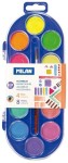 Farby akwarelowe z 4 kolorami fluorescencyjnymi i 8 metalizowanymi. Średnica pastylki 30 mm. Zawierają pędzel z naturalnego włosia dedykowany do farb akwarelowych. Pokrywka stanowi jednoczesnie paletkę do mieszania farb. Żywe, intensywne kolory uzyskuje się z nieszkodliwych, odpornych na światło pigmentów. Łatwo się spierają niemal z każdej powierzchni. Farby MILAN są zgodne z europejskimi i amerykańskimi normami bezpieczeństwa. Nie zawierają ftalanów, metali ciężkich i innych substancji toksycznych. Są bezpieczne dla dzieci. Rozmiar: 22,5 x 10 x 1,5 cm.