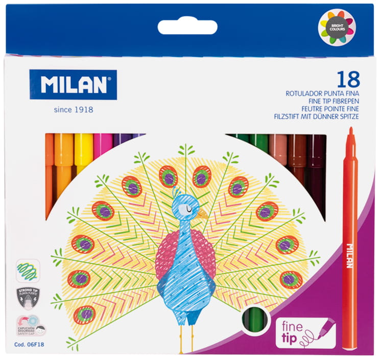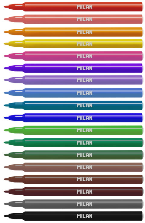 Flamastry z cienką końcówką o średnicy 2 mm. Szczególnie nadają się do rysowania konturów i pisania krótkimi pociągnięciami. Tusz na bazie wody tworzy jaskrawe i intensywne kolory, które można ze sobą mieszać. Tusz można łatwo wyprać z większości tkanin (moczyć tkaninę w zimnej wodzie przez godzinę, a następnie prać w pralce w niskiej temperaturze). Końcówka odporna na mocne przyciśnięcia. Bezpieczna wentylowana skuwka umożliwia oddychanie w przypadku połknięcia. Flamastry MILAN są zgodne z europejskimi i amerykańskimi normami bezpieczeństwa. Nie zawierają ftalanów, metali ciężkich i innych substancji toksycznych. Są bezpieczne dla dzieci. Rozmiar flamastra: 15,3 x 0,8 cm. Rozmiar opakowania: 20,5 x 19,5 x 1,2 cm.