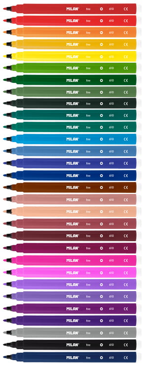 30-kolorowy zestaw flamastrów w elastycznym, przezroczystym etui. Flamastry posiadają cienką końcówkę o średnicy 2 mm. Szczególnie nadają się do rysowania konturów i pisania krótkimi pociągnięciami. Tusz na bazie wody tworzy jaskrawe i intensywne kolory, które można ze sobą mieszać. Tusz można łatwo wyprać z większości tkanin (moczyć tkaninę w zimnej wodzie przez godzinę, a następnie prać w pralce w niskiej temperaturze). Bezpieczna wentylowana skuwka umożliwia oddychanie w przypadku połknięcia. Flamastry MILAN są zgodne z europejskimi i amerykańskimi normami bezpieczeństwa. Nie zawierają ftalanów, metali ciężkich i innych substancji toksycznych. Są bezpieczne dla dzieci. Rozmiar flamastra: 16,5 x 1,04 cm. Rozmiar opakowania: 19,5 x 19 x 2 cm.
