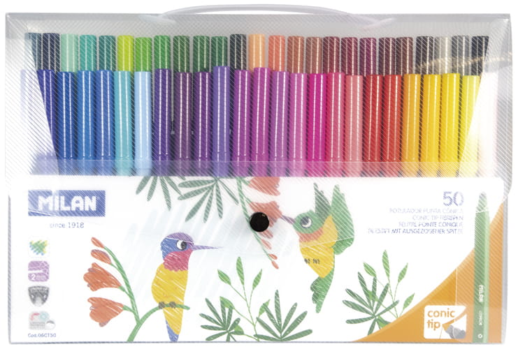 50-kolorowy zestaw flamastrów w elastycznym, przezroczystym etui. Flamastry posiadają stożkową końcówkę o średnicy 5 mm, która nie wpada do środka nawet przy silnym nacisku. Po chwilowym odkształceniu końcówka zawsze wraca do pierwotnego kształtu. Pozwala na rysowanie cienkich i grubych linii od 0,75 mm do 3 mm. Tusz na bazie wody tworzy jaskrawe i intensywne kolory, które można ze sobą mieszać. Tusz można łatwo wyprać z większości tkanin (moczyć tkaninę w zimnej wodzie przez godzinę, a następnie prać w pralce w niskiej temperaturze). Bezpieczna wentylowana skuwka umożliwia oddychanie w przypadku połknięcia. Flamastry MILAN są zgodne z europejskimi i amerykańskimi normami bezpieczeństwa. Nie zawierają ftalanów, metali ciężkich i innych substancji toksycznych. Są bezpieczne dla dzieci. Rozmiar flamastra: 16,5 x 1,04 cm. Rozmiar opakowania: 31 x 21,2 x 2,5 cm.