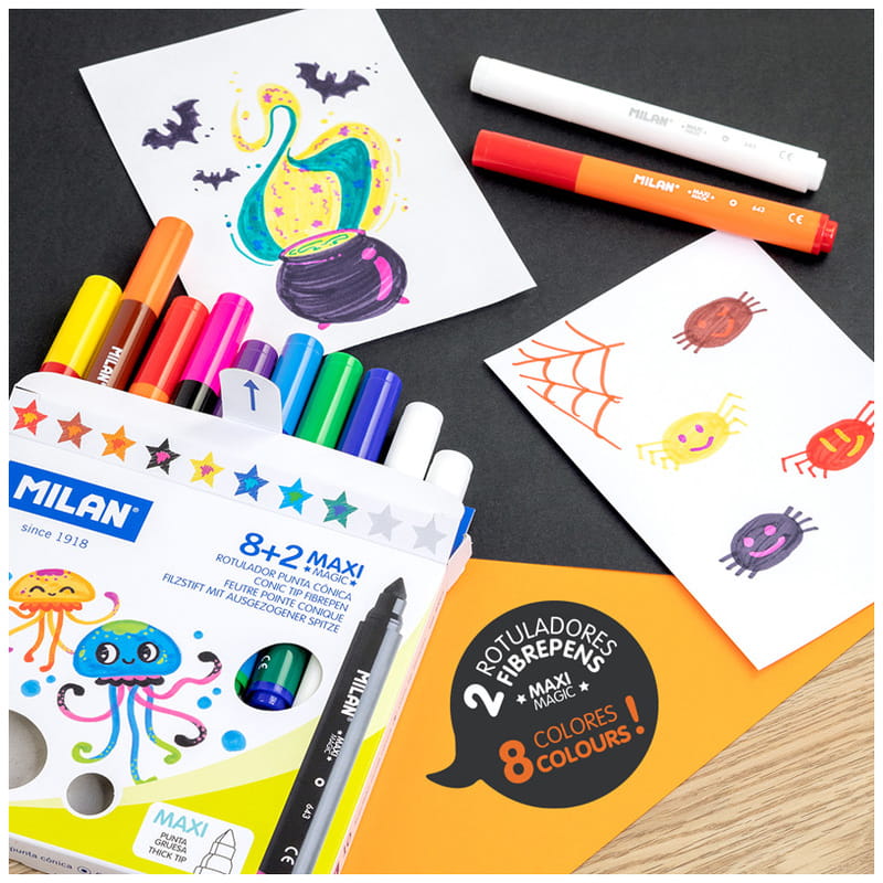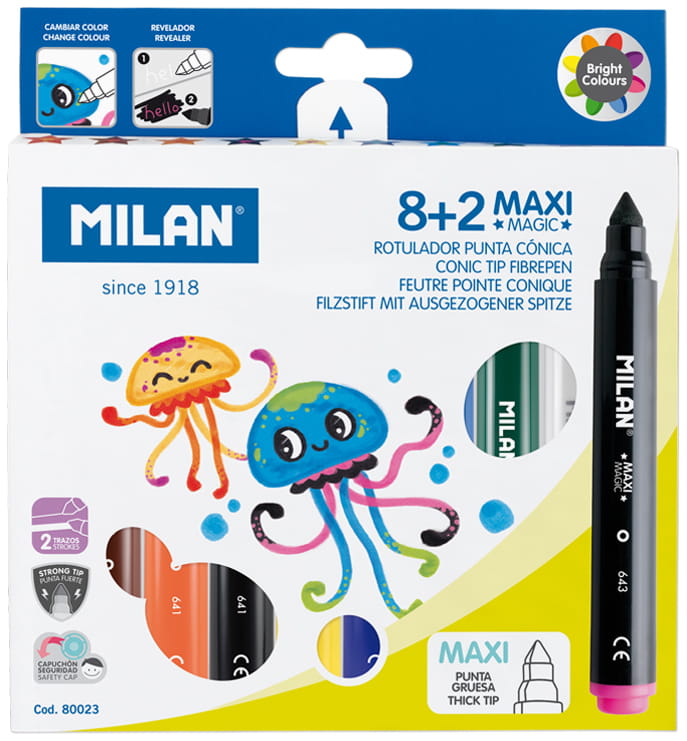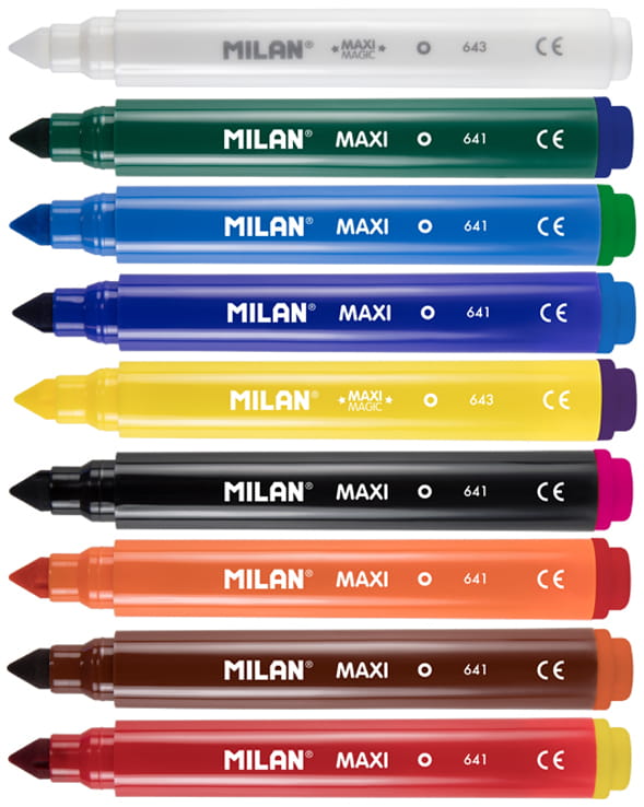 Flamastry grube MAXI MAGIC zmieniające kolory. W opakowaniu jest 8 kolorowych flamastrów oraz 2 specjalne białe flamastry. Za pomocą kolorowych flamastrów pomaluj rysunek, odczekaj 5 sekund a następnie użyj białego flamastra aby zobaczyć jak zmieniają się kolory na takie jakie są na skuwce. Możesz także pisać tajne wiadomości białym flamastrem, a następnie pomalować je kolorowym flamastrem. Rozmiar MAXI jest idealny dla dzieci. Flamastry posiadają wytrzymałą i elastyczną stożkową końcówką o średnicy 7,5 mm, która nie wpada do środka nawet przy silnym nacisku. Po chwilowym odkształceniu końcówka zawsze wraca do pierwotnego kształtu. Pozwala na rysowanie cienkich i grubych linii od 1 mm do 3,25 mm. Tusz na bazie wody tworzy jaskrawe i intensywne kolory. Można go łatwo wyprać z większości tkanin (moczyć w zimnej wodzie przez godzinę, a następnie prać w pralce w niskiej temperaturze). Bezpieczna wentylowana skuwka umożliwia oddychanie w przypadku połknięcia. Flamastry MILAN są zgodne z europejskimi i amerykańskimi normami bezpieczeństwa. Nie zawierają ftalanów, metali ciężkich i innych substancji toksycznych. Są bezpieczne dla dzieci. Rozmiar flamastra: 13,5 x 1,43 cm. Rozmiar opakowania: 17 x 15,6 x 1,7 cm.