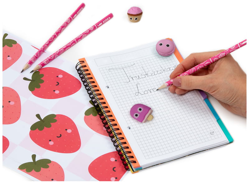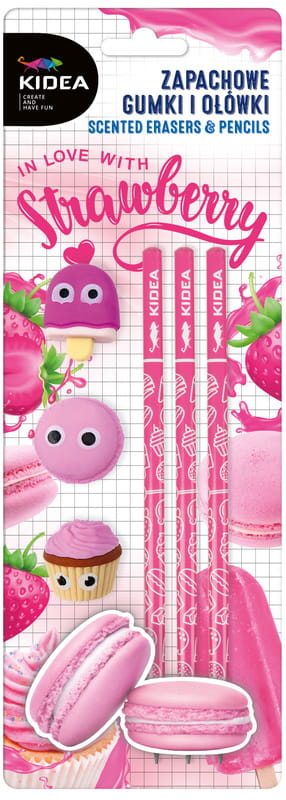Zapachowy niezbędnik Kidea o słodkim, truskawkowym aromacie, który zawiera 3 ołówki o twardości rysika HB oraz trzy smakowite gumki w kształcie loda na patyku, makaronika i babeczki. Średniej twardości rysik i trójkątny kształt sprawiają, że ołówki są poręczne i wygodne w użyciu. Zapachowe gumki nie tylko słodko się prezentują, ale również precyzyjnie wymazują ołówek. Sprawdzi się zarówno na lekcji matematyki jak i plastyki, a jego truskawkowy zapach umili dzień spędzony w szkolnej ławce.