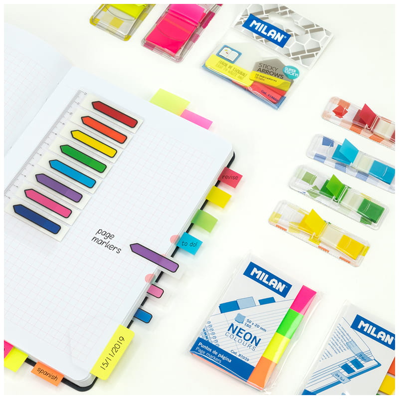 Samoprzylepne, przezroczyste, plastikowe zakładki indeksujące w kształcie strzałek, w 8 kolorach. Zawierają linijkę. 120 strzalek po 15 w każdym kolorze: czerwonym, pomarańczowym, żółtym, zielonym, niebieskim, różowym, liliowym i fioletowym. Bardzo dobrej jakości klej odporny na wielokrotne odklejanie i przyklejanie. Rozmiar strzałki: 45 x 12 mm.