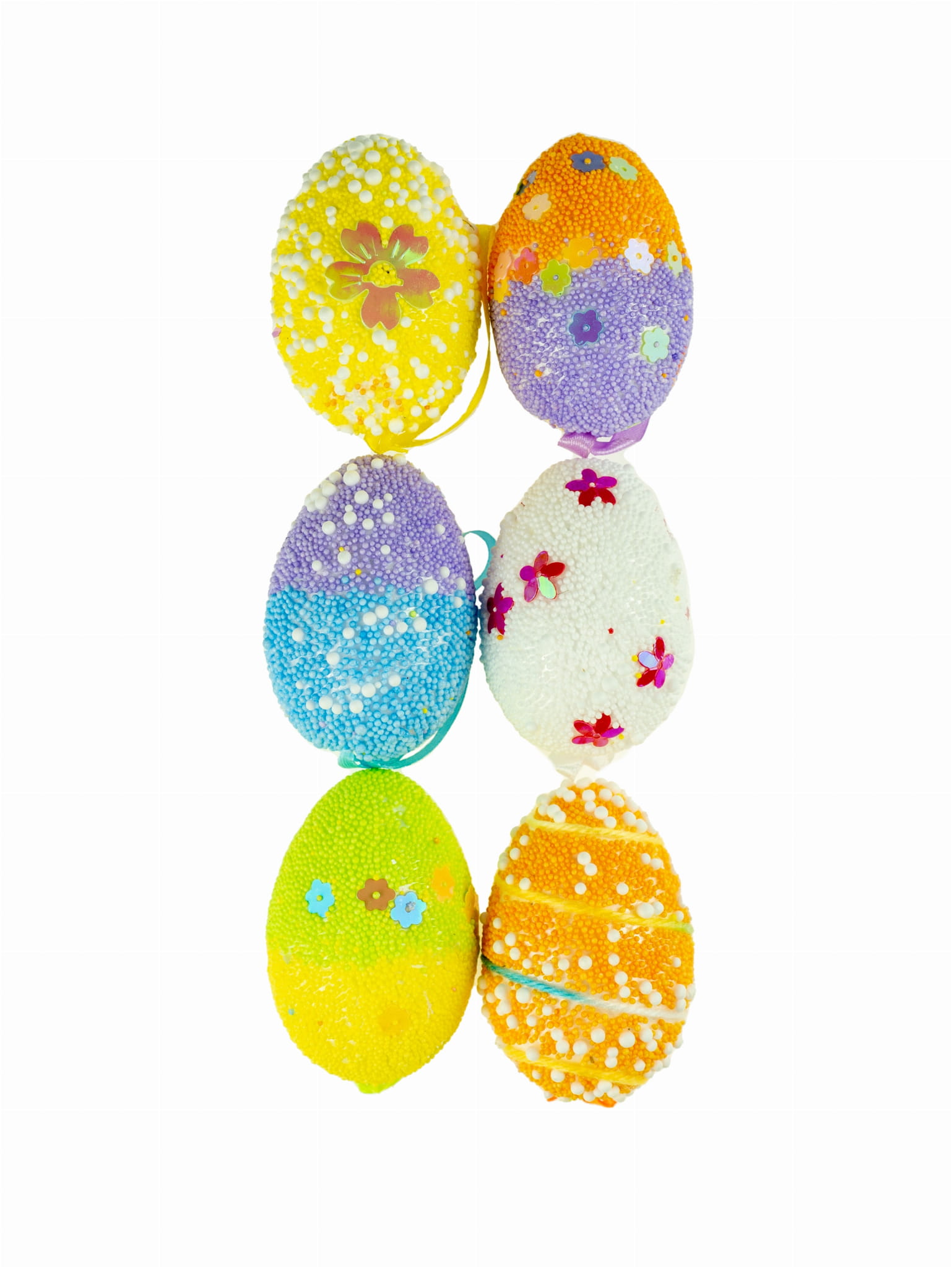 Jajka styropianowe kolorowe z dekoracjami i wzorami.