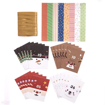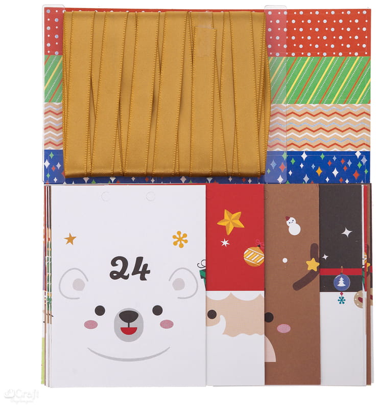 W zestawie znajdziesz 24 pudełeczka z uroczymi wzorami Mikołajów, reniferów, bałwanków i misiów polarnych, ozdobne naklejki w różnych kolorach, służące do zamknięcia opakowań oraz złota wstążeczka do wykonania zawieszek. Możesz też przeciągnąć całą wstążeczkę przez wszystkie pudełeczka i stworzyć z nich duży, wiszący kalendarz.