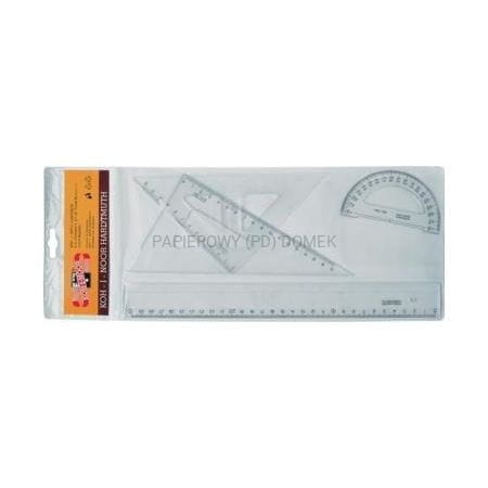 Zestaw wykonany z przezroczystego tworzywa sztucznego. Linijka i ekierki mają podcięcia do rysunku tuszem.