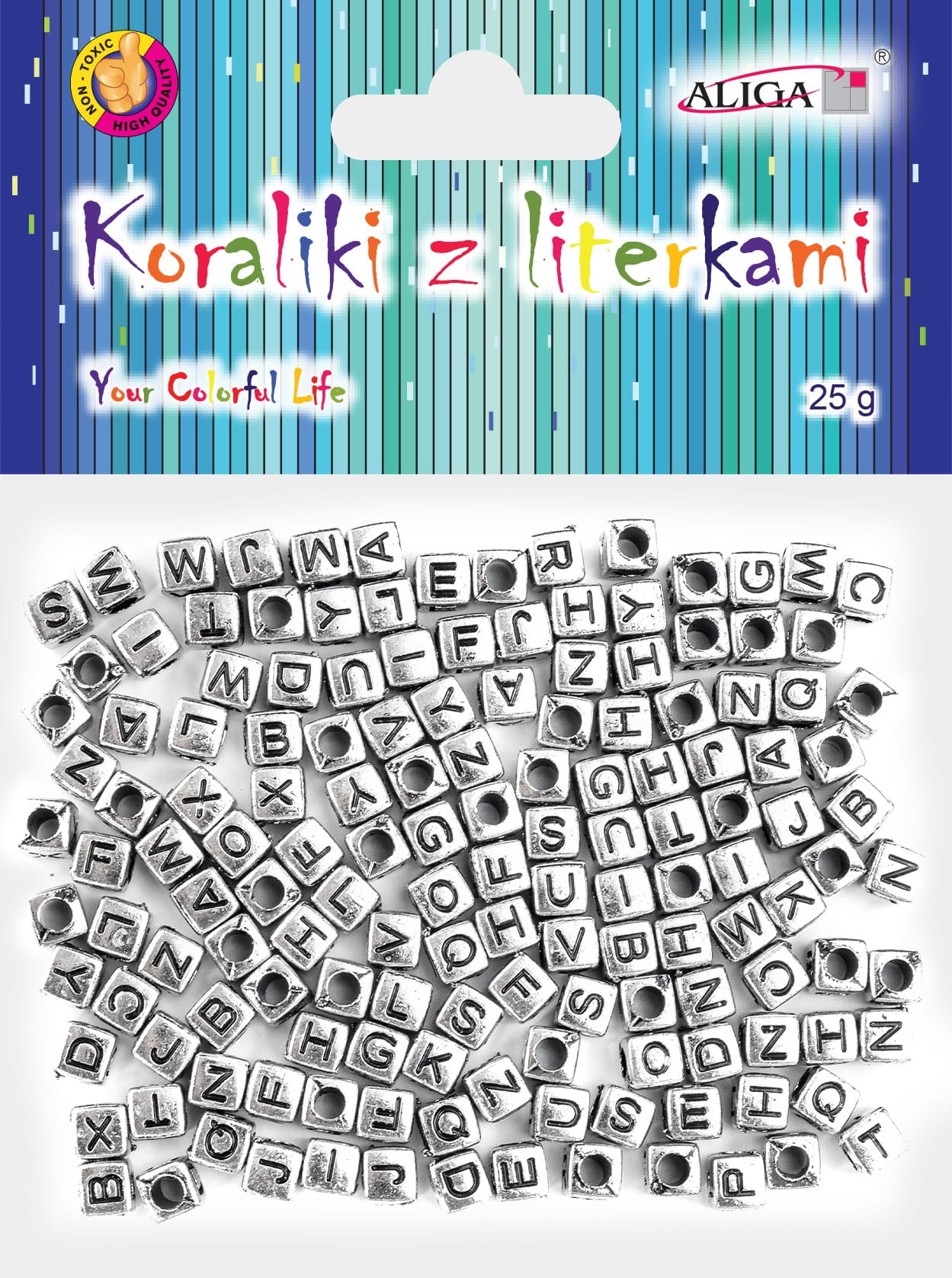 Koraliki metalowe srebrne literki 6x6 mm 25g, Aliga