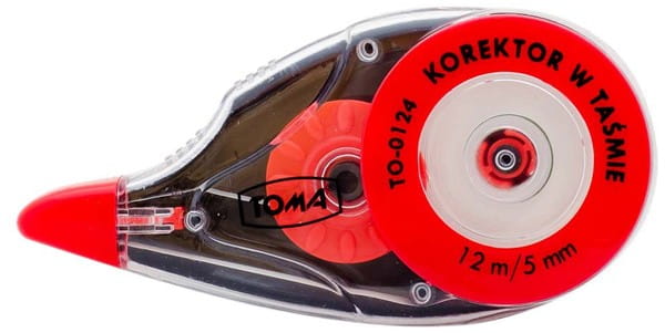 Taśma korekcyjna o szerokości 5 mm i długości 12 m, ergonomiczna, przeźroczysta obudowa zapewniająca widoczny poziom zużycia, system kontroli naprężenia taśmy, uniwersalne wykorzystanie na różnych rodzajach papieru.