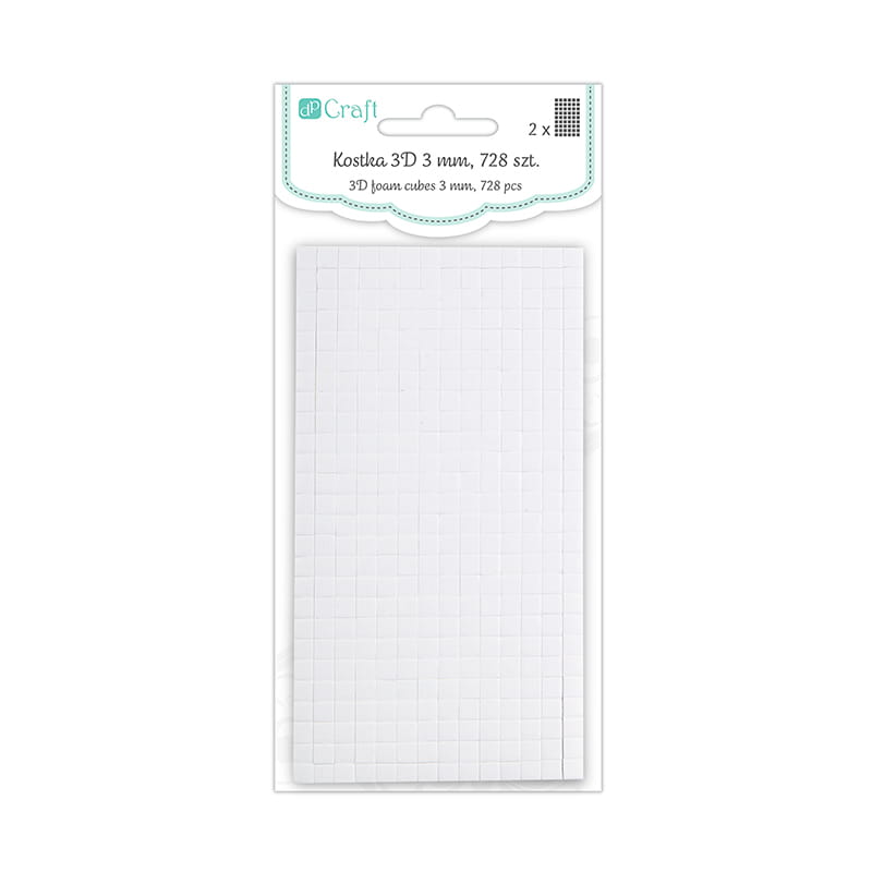 Przestrzenna taśma dwustronnie klejąca w formie kosteczek. Ułatwia mocowanie niewielkich elementów dekoracyjnych zarówno papierowych jak i z innych tworzyw, np. kryształków, kwiatków itp. Niezbędna do tworzenia przestrzennego efektu w kartkach okolicznościowych, scrapbookingu oraz innych projektach kreatywnych. Ilość w opakowaniu: 728 kostek (2 arkusze) Grubość: 3 mm Rozmiar 1 kostki: 5 mm x 5 mm