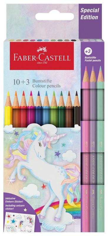 Kredki 10-kol. Jednorożec + 3 kolory pastelowe + naklejki, Faber-Castell