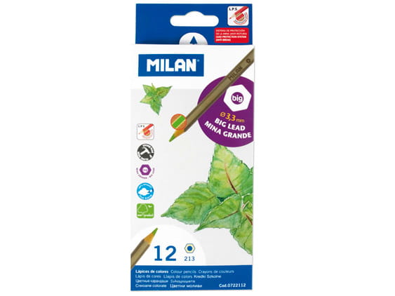 Kredki ołówkowe, sześciokątne, cienkie z bardzo grubym grafitem o średnicy 3,5 mm. Naturalne drewniane wykończenie. Posiadają unikalny system Lead Protection System (LPS), który zwiększa odporność grafitu na złamania poprzez przyklejenie go do drewna. Drewno jest wytrzymałe i miękkie umożliwiając łatwe temperowanie. Wysokiej jakości pigmenty w żywych, intensywnych kolorach są odporne na działanie światła. Kreska wykonana kredką MILAN jest miękka, jednolita o wyraźnym odcieniu. Nie tworzy rowków ani nie niszczy papieru. Drewno pochodzi ze zrównoważonych plantacji. Każda kredka ma nadrukowaną nazwę koloru po angielsku. Kredki MILAN są zgodne z europejskimi i amerykańskimi normami bezpieczeństwa. Nie zawierają ftalanów, metali ciężkich i innych substancji toksycznych. Są bezpieczne dla dzieci. Rozmiar kredki: 17,5 x 0,64 cm. Rozmiar opakowania: 21 x 9 x 1 cm.
