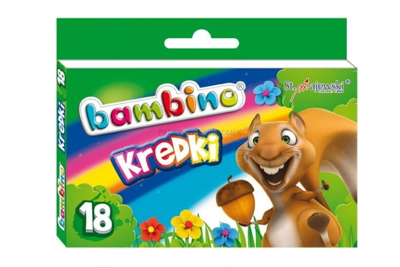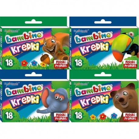 - Kredki Bambino wykonane są z glinki kaolinowej, co nieporównywalnie podnosi ich walory użytkowe względem kredek świecowych, woskowych czy ołówkowych. Każda kredka posiada papierową ochronną owijkę z własną grafiką (na każdej kredce inne zwierzątko).