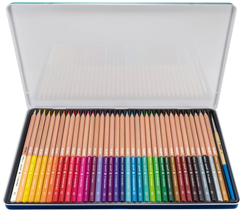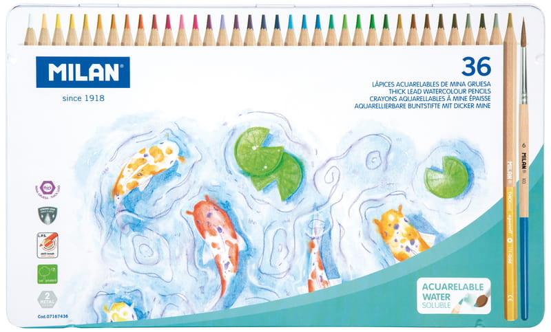 Kredki akwarelowe sześciokątne, cienkie z bardzo grubym grafitem o średnicy 3,5 mm. W zestawie dostępny 1 pędzel szkolny z mieszanką włosia koziego 70% i syntetycznego 30% oraz dwie kredki metaliczne: złota i srebrna. Naturalne drewniane wykończenie z lakierowaną końcówką w kolorze grafitu kredki. Kredki akwarelowe łączą wszechstronność farb akwarelowych z precyzją kolorowych kredek ołówkowych. Można je stosować na sucho lub mokro lub łącząc obie techniki. Posiadają unikalny system Lead Protection System (LPS), który zwiększa odporność grafitu na złamania poprzez przyklejenie go do drewna. Drewno jest wytrzymałe i miękkie umożliwiając łatwe temperowanie. Wysokiej jakości pigmenty w żywych, intensywnych kolorach są odporne na działanie światła. Kreska wykonana kredką MILAN jest miękka, jednolita o wyraźnym odcieniu. Nie tworzy rowków ani nie niszczy papieru. Drewno pochodzi ze zrównoważonych plantacji. Każda kredka ma nadrukowaną nazwę koloru po angielsku. Rozmiar kredki: 17,5 x 0,64 cm. Rozmiar opakowania: 30 x 18,5 x 1,3 cm.