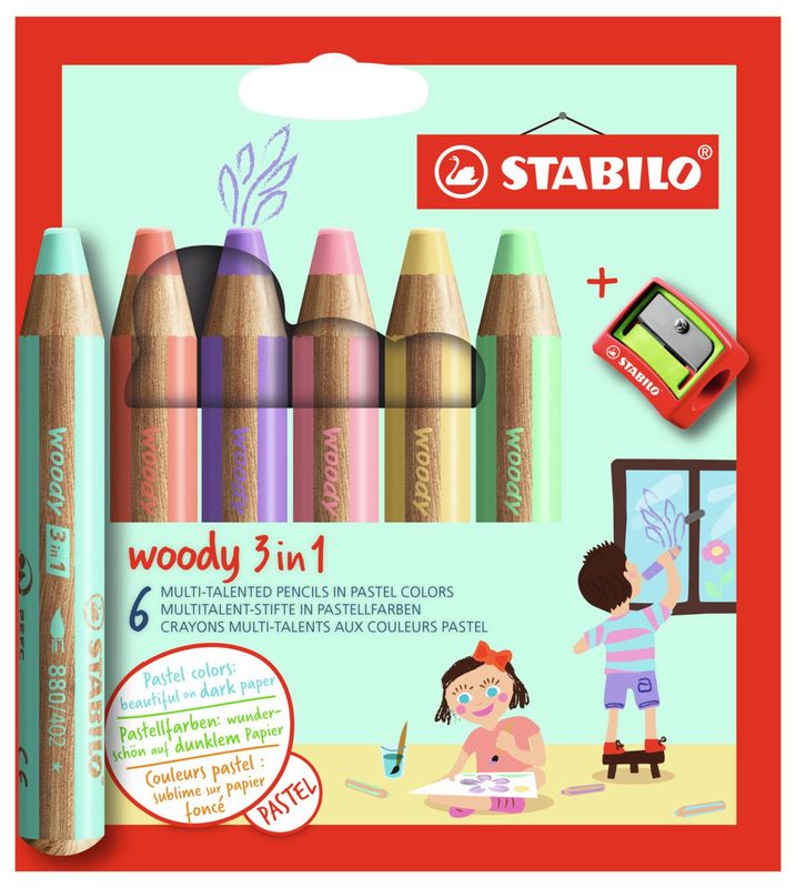 Kredki grube Stabilo Woody pastelowe 6 kolorów 3w1 + temperówka
