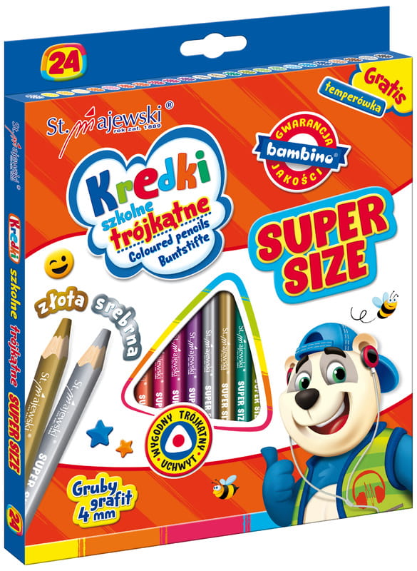 Kredki ołówkowe Bambino trójkątne 24 kolory z grubym grafitem + temperówka Super Size, St. Majewski